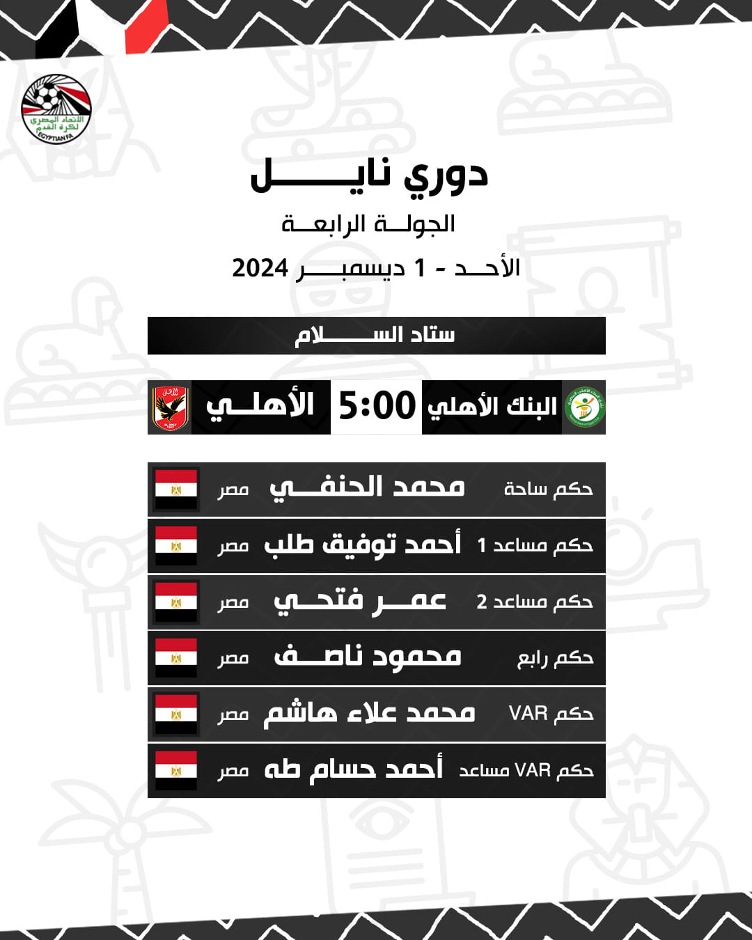 وتقام مباراة الأهلي والبنك الأهلي اليوم الأحد الموافق الأول من ديسمبر في الخامسة مساء، وذلك ضمن منافسات الجولة الرابعة من الدوري المصري الممتاز.