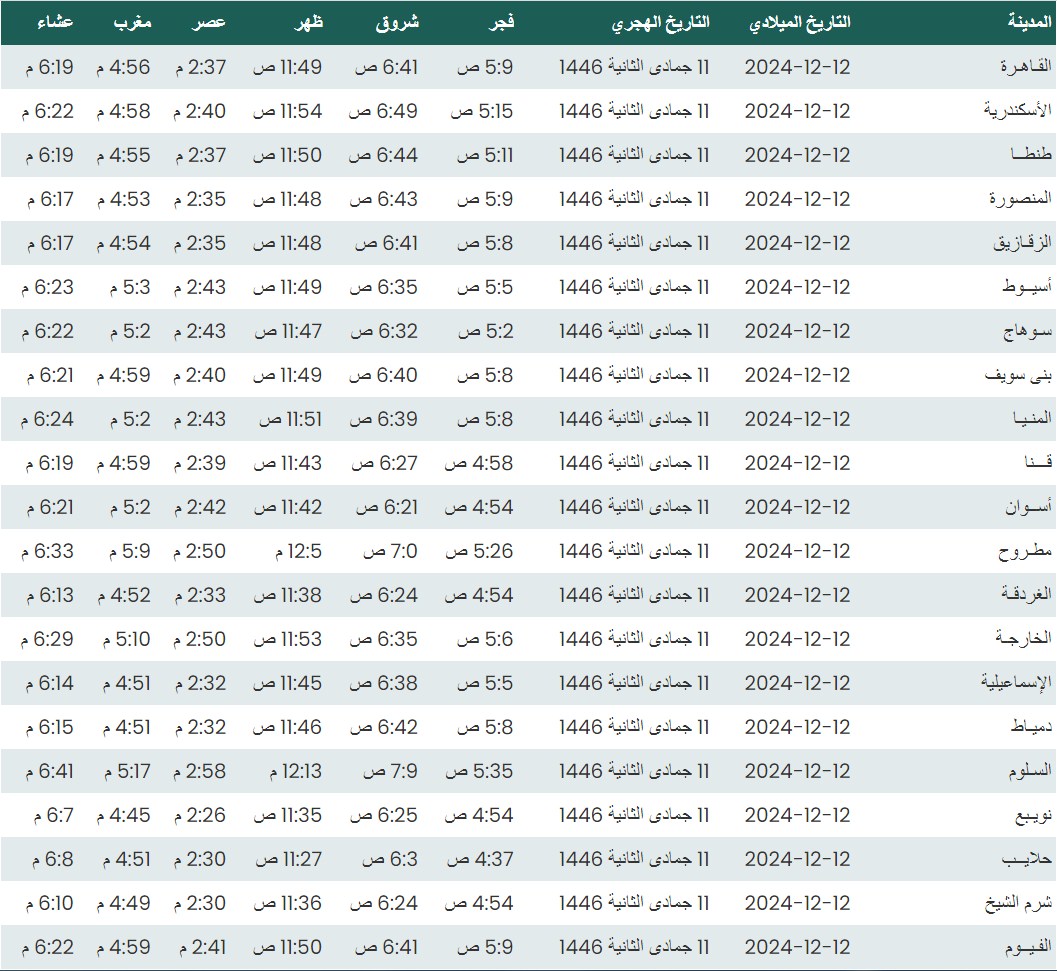 مواقيت الصلاة اليوم الخميس 12 - 12- 2024 في القاهرة والمحافظات