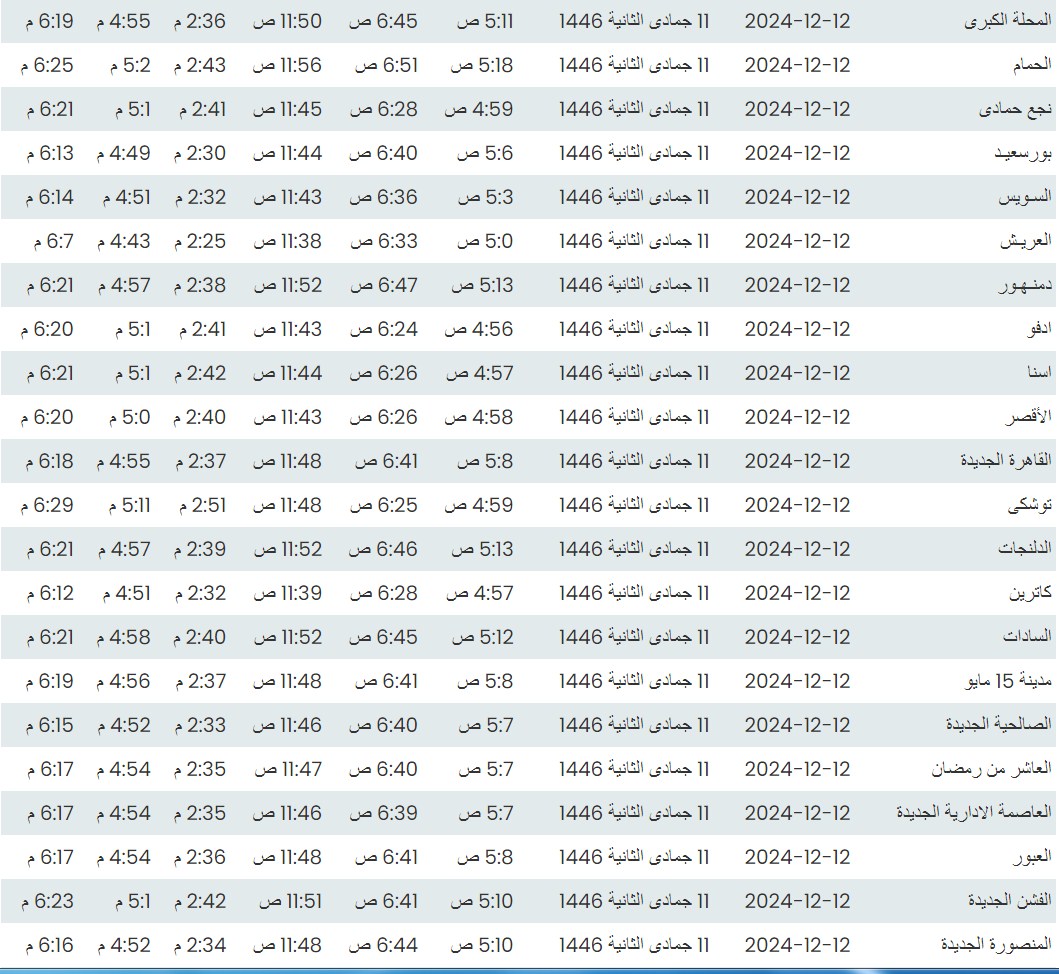 مواقيت الصلاة اليوم وفقًا للتوقيت المحلي لمدينتي القاهرة والإسكندرية وكذلك، مواقيت الصلاة، لعدد من مدن ومحافظات الجمهورية من واقع بيانات الهيئة العامة للمساحة