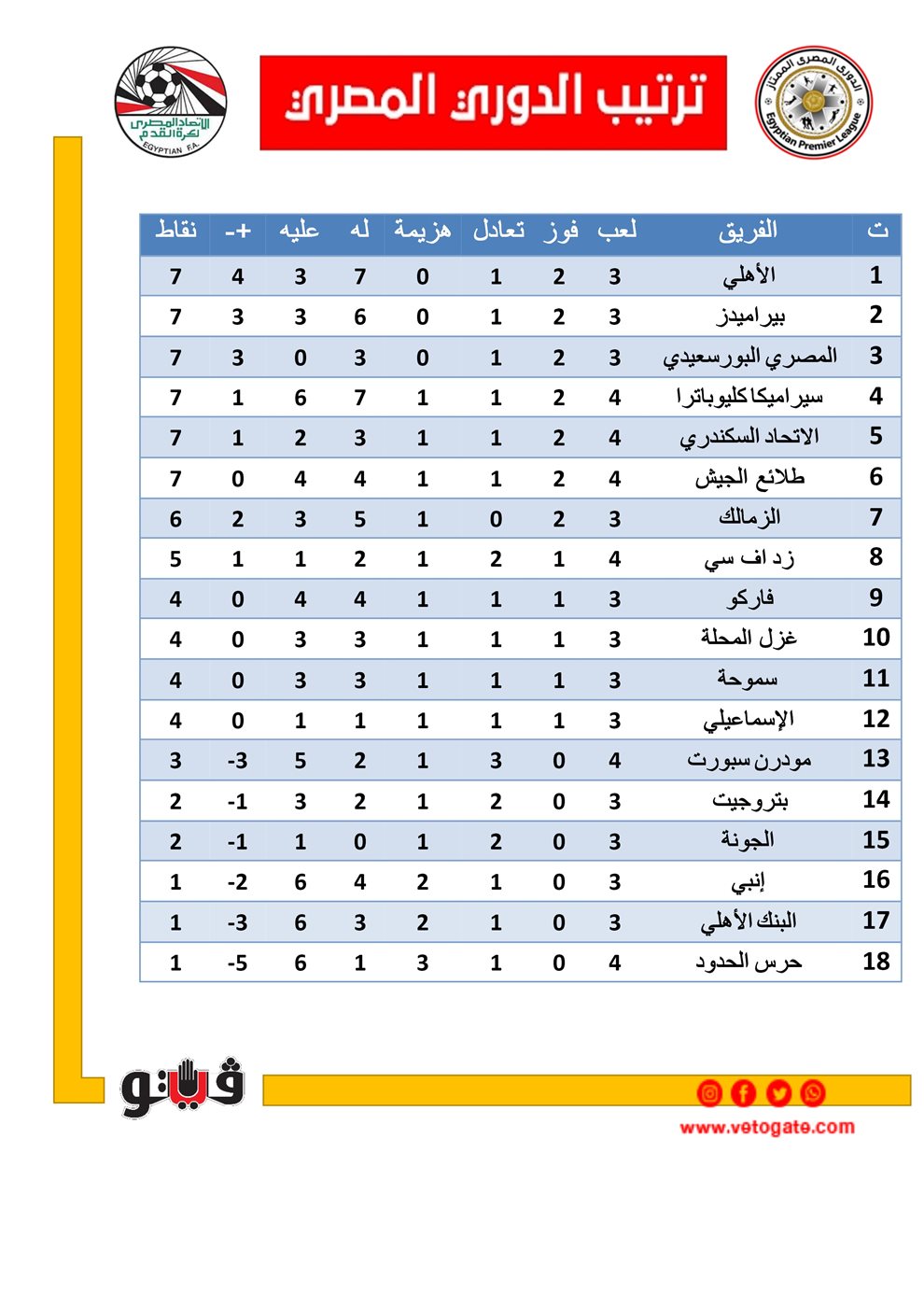 ترتيب الدوري المصري، يتصدر النادي الأهلي جدول ترتيب الدوري المصري الممتاز بالتساوي مع 5 فرق، وهي: بيراميدز والمصري البورسعيدي والاتحاد السكندري وسيراميكا كليوباترا وطلائع الجيش قبل مباريات اليوم الأحد في الجولة الرابعة.