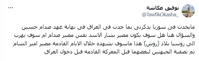 مصير بشار الأسد الغامض، توفيق عكاشة: ما يحدث في سوريا يذكرني بنهاية صدام