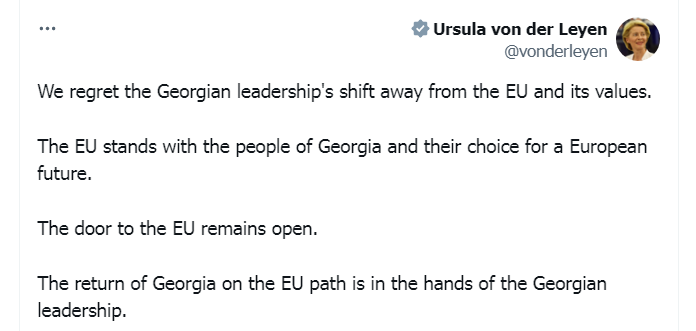 وعلقت رئيسة الاتحاد الأوروبي، أورسولا فون دير لاين، فقالت: "نحن نأسف لابتعاد القيادة الجورجية عن الاتحاد الأوروبي وقيمه."