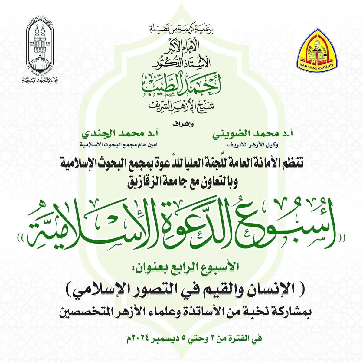 أعلن مجمع البحوث الإسلامية بالأزهر الشريف عن انطلاق فعاليات الأسبوع الرابع للدعوة الإسلاميَّة بداية من اليوم الإثنين ويستمر لمدة أربعة أيام، والذي يُعقد بجامعة الزقازيق بعنوان: «الإنسان والقيم في التصور الإسلامي»، وتنظمه الأمانة العامة للجنة العليا للدعوة بالمجمع