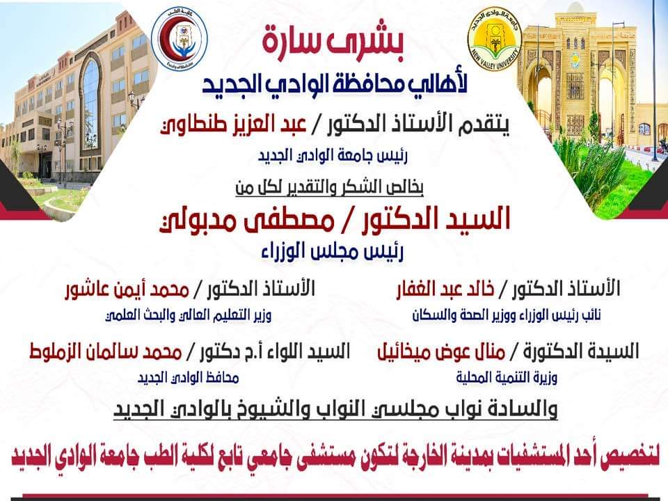 أعلن الدكتور عبد العزيز طنطاوي رئيس جامعة الوادي الجديد، عن موافقة الدكتور مصطفى مدبولي، رئيس مجلس الوزراء على تخصيص أحد مستشفيات مدينة الخارجة لتكون مستشفى جامعي تابع لكلية الطب جامعة الوادي الجديد.
