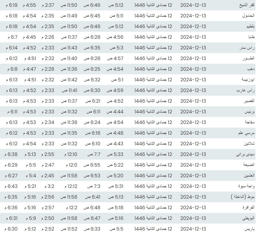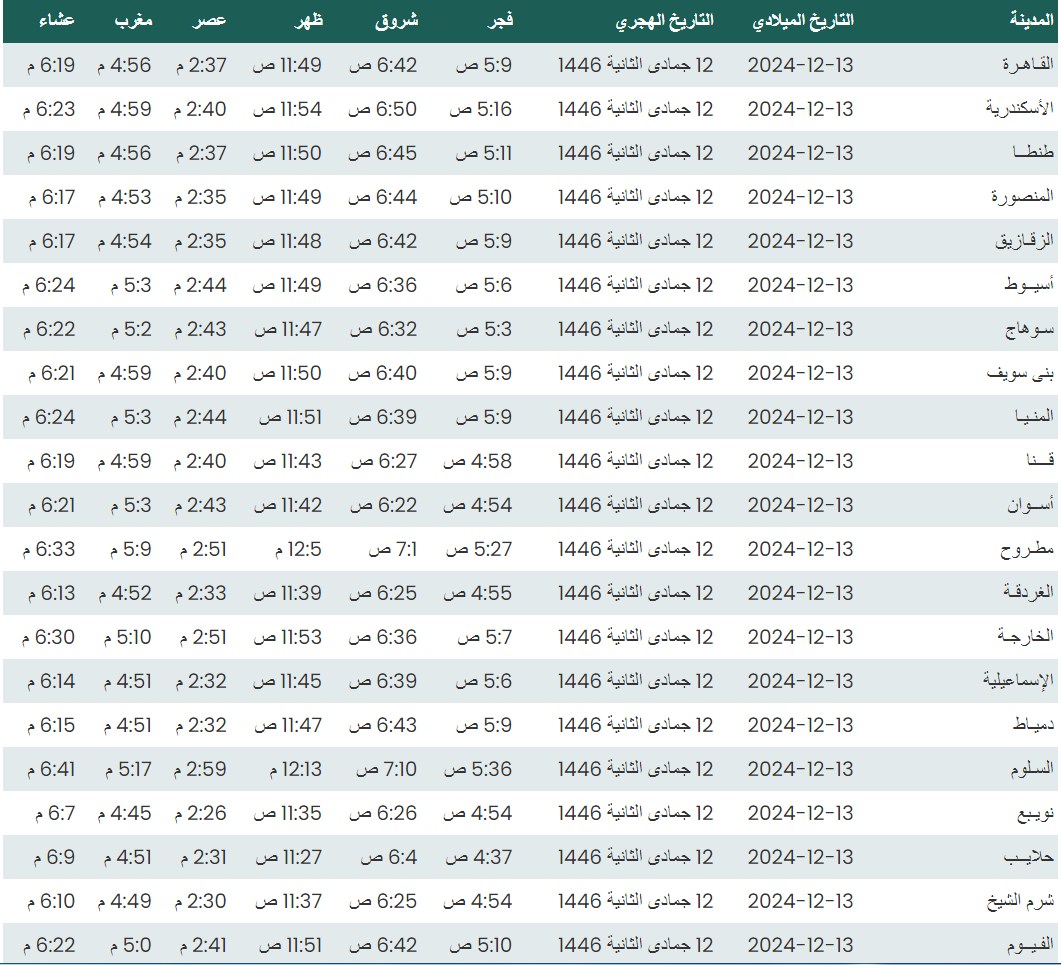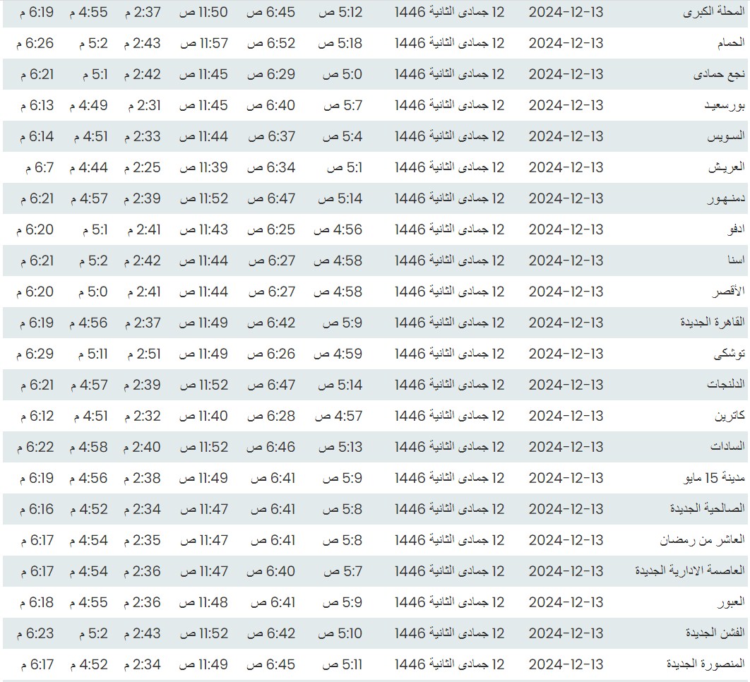 وفيما يلي مواقيت الصلاة، لعدد من مدن ومحافظات الجمهورية من واقع بيانات الهيئة العامة للمساحة