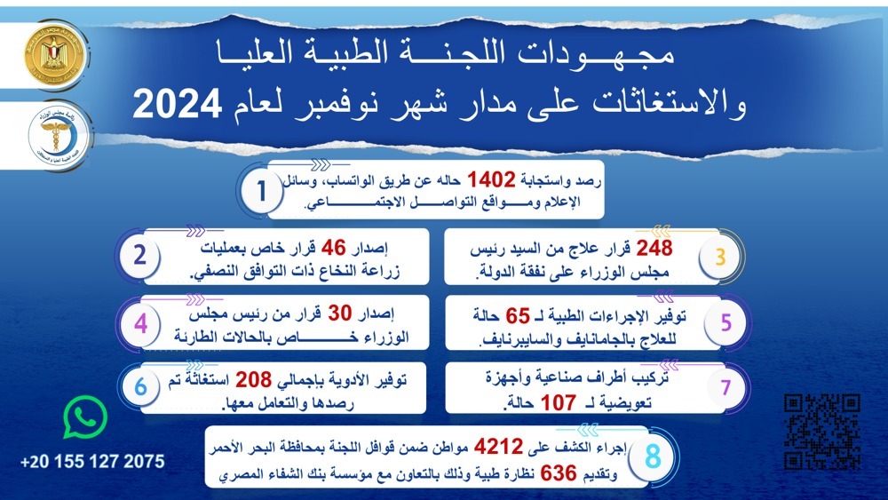 وأشار التقرير إلى أن جهود اللجنة الطبية العليا والاستغاثات خلال شهر نوفمبر الماضي تضمنت الاستجابة لـ 1402 حالة تم رصدها عن طريق تطبيق "واتس آب" ووسائل الإعلام ومواقع التواصل الاجتماعي.