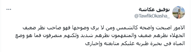 وقال توفيق عكاشة في رسالته الغامضة، عبرمنصة "أكس"، تويتر سابقًا، عن بحيرة طبرية: "الأمور أصبحت واضحه كالشمس، ومن لا يرى وضوحها فهو صاحب نظر ضعيف، الجهلاء نظرهم ضعيف والمتفهمون نظرهم شديد ولكنهم منصرفون، فما هو وضع المياه فى بحيرة طبرية عليكم متابعته وإخبارى"