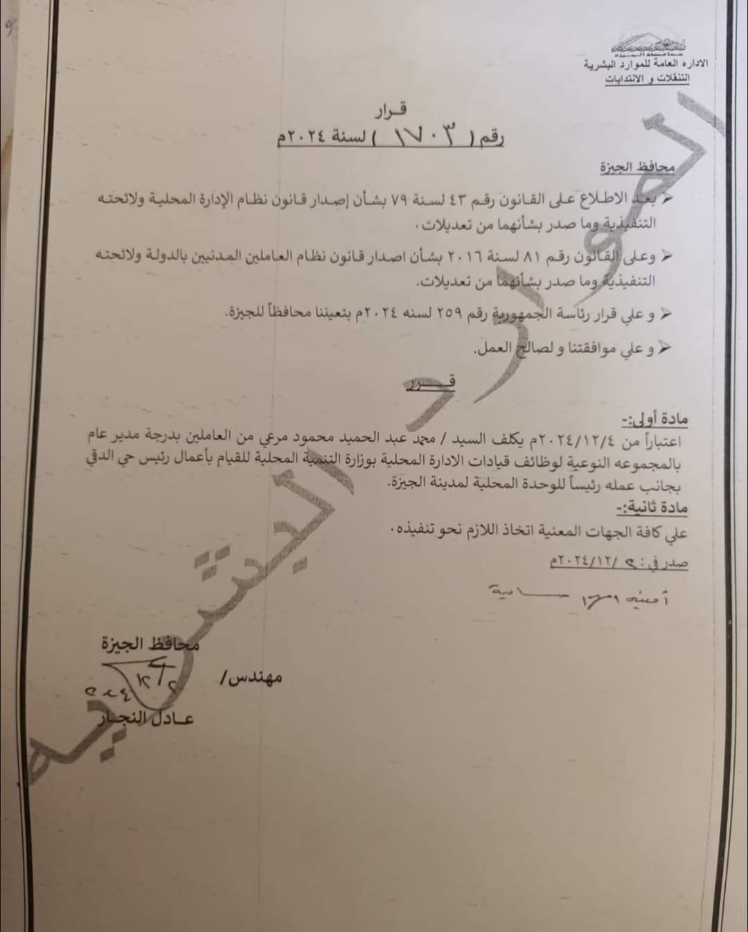 وفي هذا الصدد، أصدر محافظ الجيزة قرارًا بتكليف محمد مرعي بتولي منصب رئيس حي الدقي خلفًا للواء أحمد عبد الفتاح.