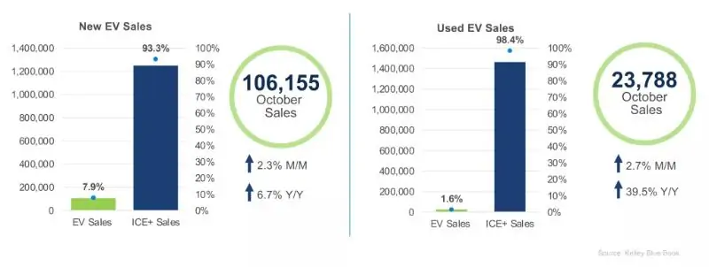 وفقًا لما نشرتها Cox Automotive، أن سوق السيارات الكهربائية المستعملة حقق طفرة خاصة به، في أكتوبر، تم بيع 23,788 سيارة كهربائية مستعملة – بزيادة 2.7% عن سبتمبر وارتفاع مذهل بنسبة 39.5% على أساس سنوي، وتشكل السيارات الكهربائية المستعملة الآن 1.6% من سوق السيارات المستعملة الإجمالية.