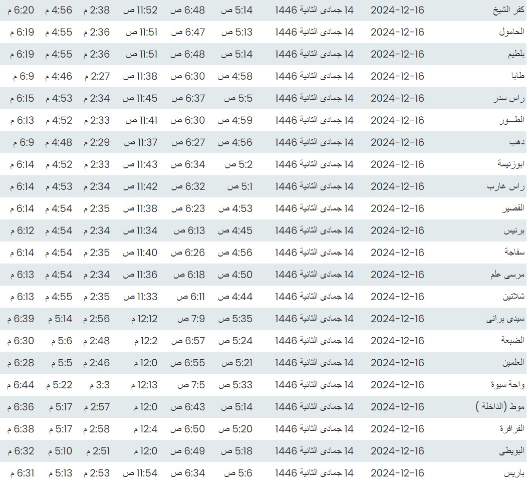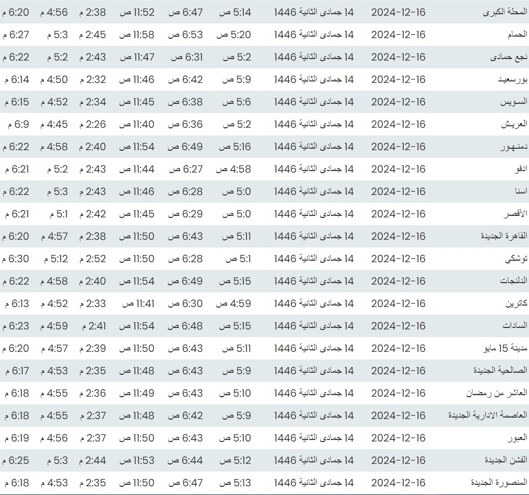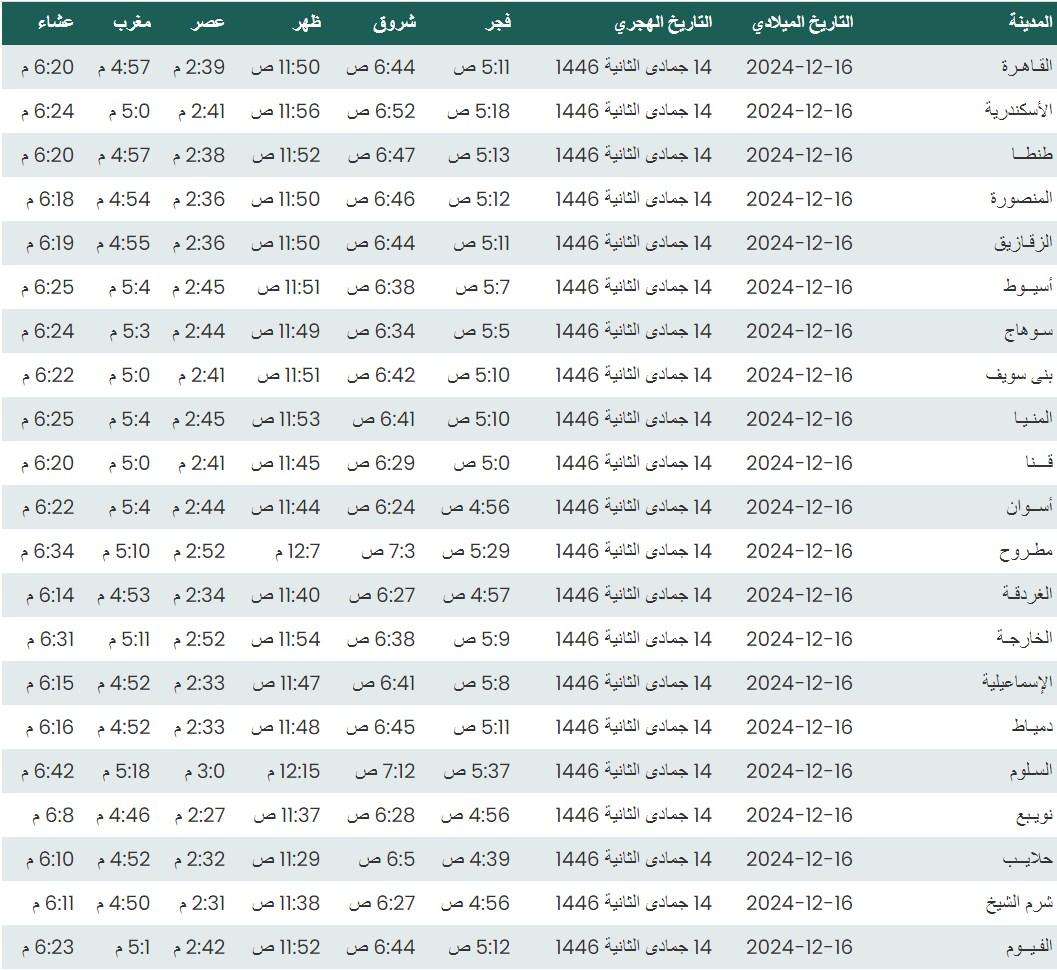 وفيما يلي مواقيت الصلاة، لعدد من مدن ومحافظات الجمهورية من واقع بيانات الهيئة العامة للمساحة