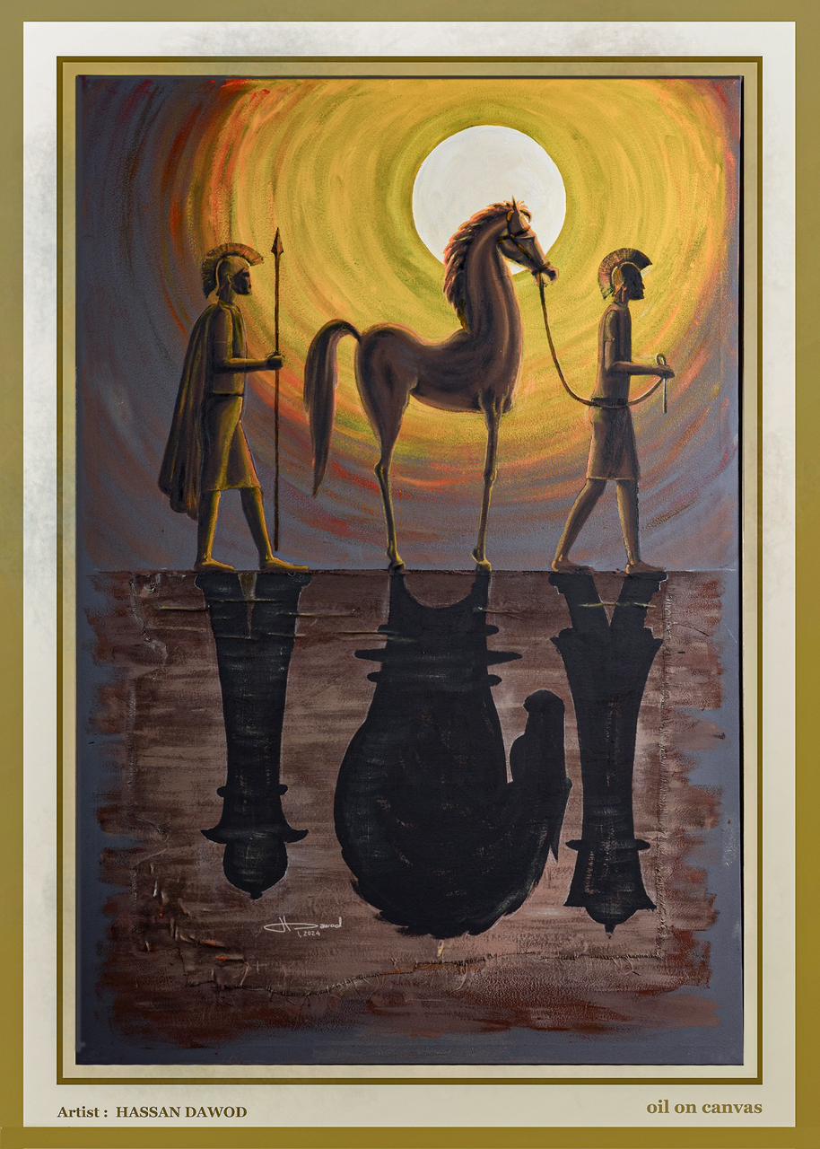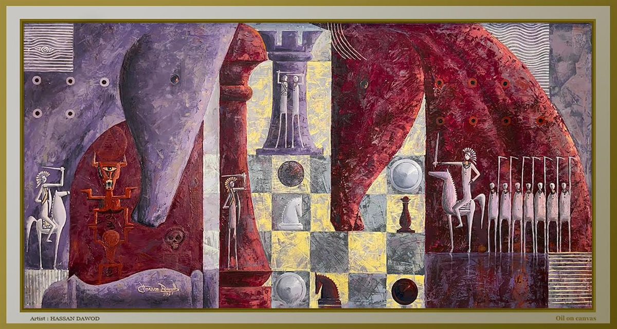 مضيفًا: “استعان داوود بعناصر الشطرنج التي تحمل أبعادا تعبر عن العداء البشري الحضارة الإنسانية على مر العصور، ولكونه معماريًّا أجد في لوحاته تكوينات بنائية متراصة باتزان سواء بالمتماثل المتضاد أو بتوازن الكتلة من عناصر اللعبة والشخوص”.
