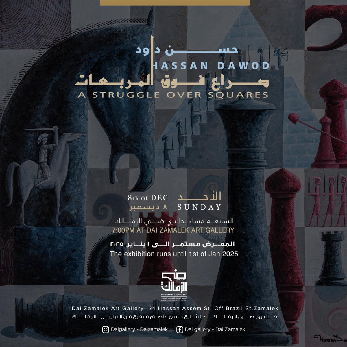 يستضيف أتيليه العرب للثقافة والفنون، بجاليري ضي الزمالك، مساء الأحد 8 ديسمبر الجاري، معرضًا تشكيليًّا جديدًا للفنان حسن داوود يحمل عنوان "صراع فوق المربعات".