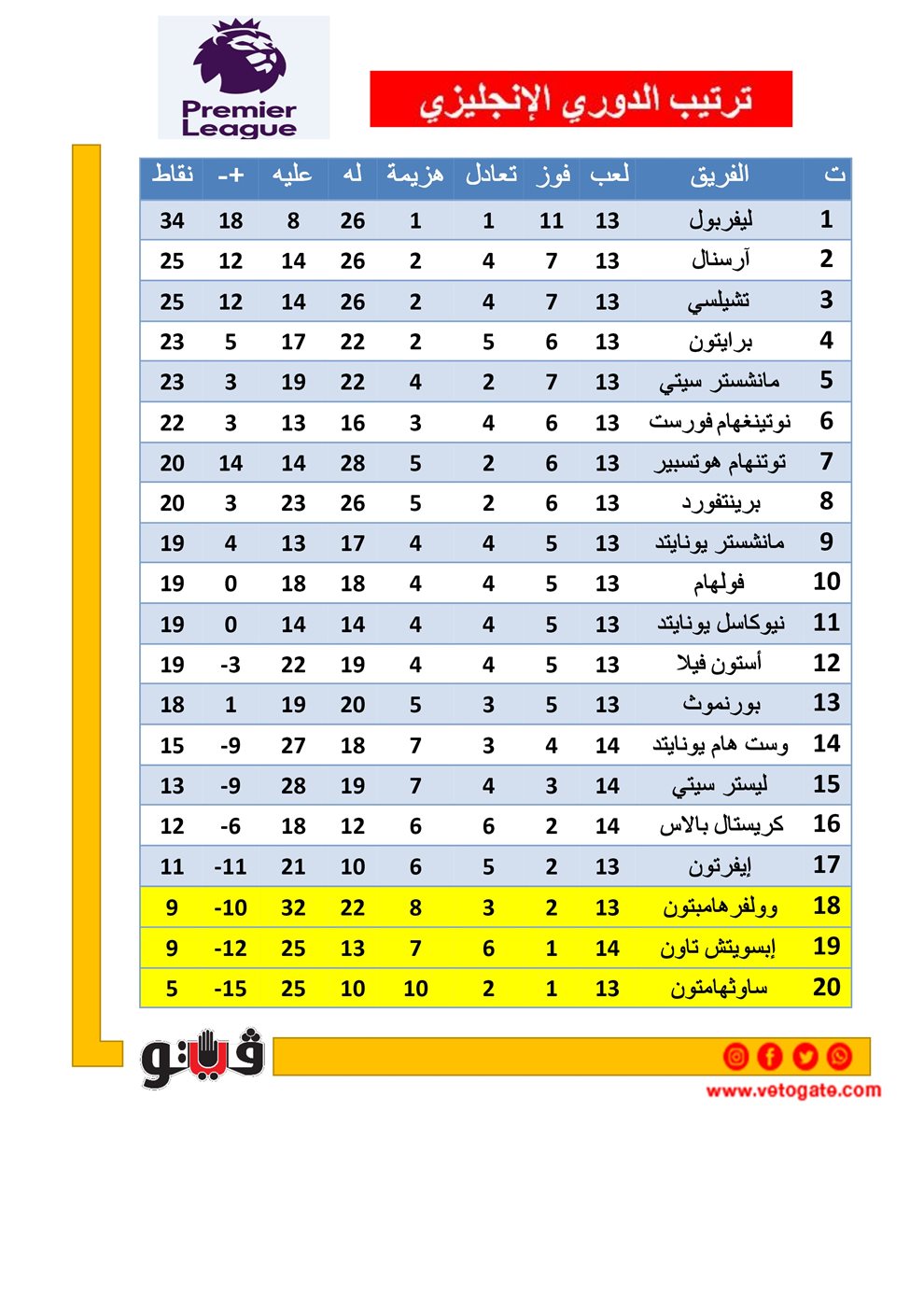 ترتيب الدوري الإنجليزي، يتصدر ليفربول جدول ترتيب الدوري الإنجليزي قبل مباريات اليوم الأربعاء في الجولة الـ 14 من البريميرليج.