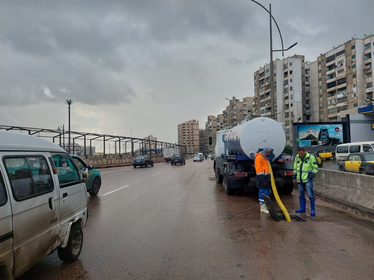 انتشار سيارات الصرف لكسح مياه الأمطار في شوارع الإسكندرية