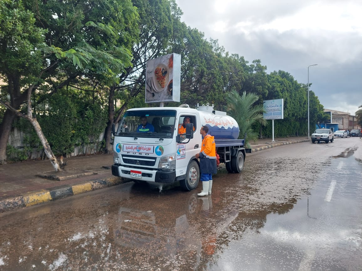 وانتشرت سيارات الصرف الصحي بالتعاون والتنسيق مع أحياء المحافظة ورفع حالة الطوارئ القصوى والاستعدادات فى كافة الميادين لرفع أي تراكمات للأمطار.