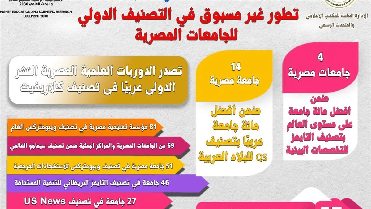 وتم إدراج 69 من الجامعات والمؤسسات البحثية المصرية ضمن تصنيف سيماجو العالمي للمؤسسات البحثية والأكاديمية لعام 2024.