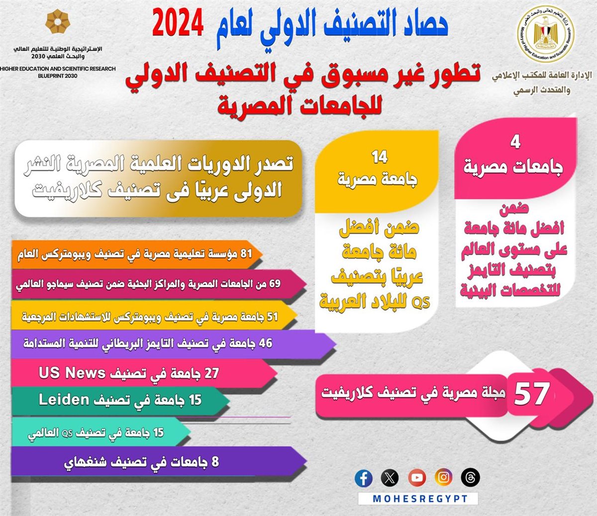 وتم إدراج 69 من الجامعات والمؤسسات البحثية المصرية ضمن تصنيف سيماجو العالمي للمؤسسات البحثية والأكاديمية لعام 2024.