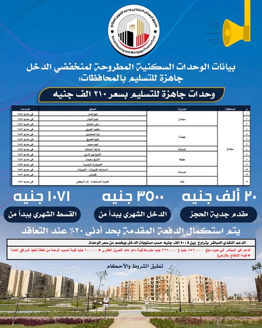 والطرح الجديد يتضمن 23958 وحدة سكنية جاهزة للتسليم الفوري للمواطنين منخفضي ومتوسطي الدخل بعدد من المحافظات بمختلف مناطق الجمهورية، بأسعار تتراوح ما بين 184 ألف جنيه وحتى 400 ألف جنيه.