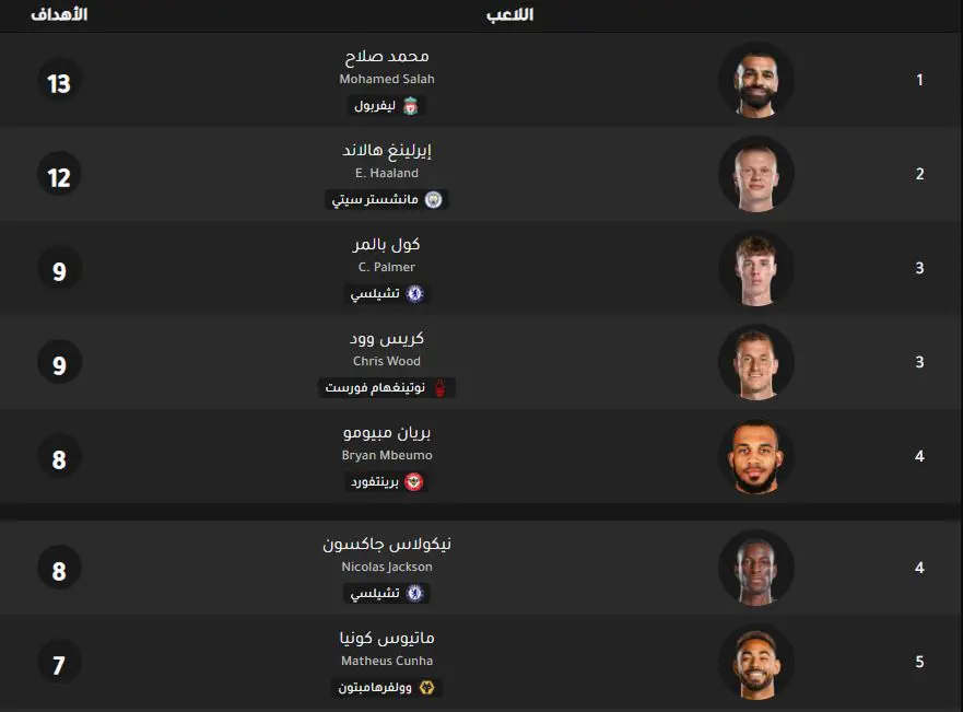 وجاء ترتيب هدافي الدوري الإنجليزي بعد هدفي صلاح كالتالي: