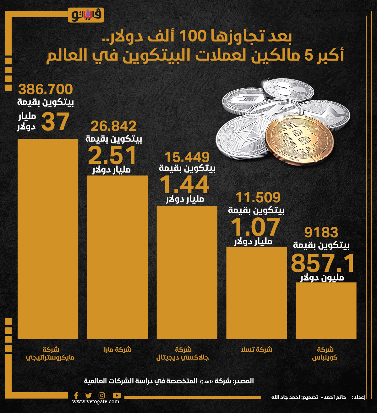 بعد تجاوزها 100 ألف دولار.. أكبر 5 مالكين لعملات البيتكوين في العالم (إنفوجراف)