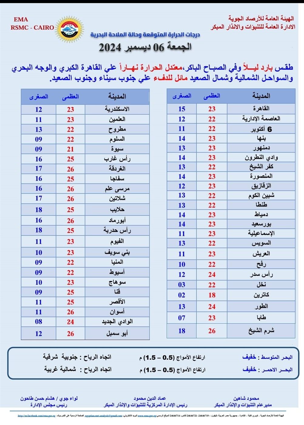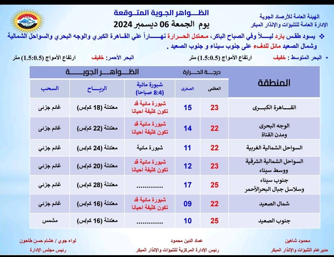 وقالت هيئة الأرصاد، إن طقس اليوم الجمعة يكون باردًا ليلًا وفي الصباح البارد، معتدل الحرارة نهارًا على القاهرة الكبرى والوجه البحري والسواحل الشمالية وشمال الصعيد، مائل للدفء على جنوب سيناء وجنوب الصعيد.