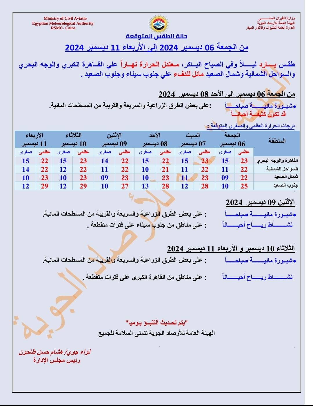 وأشارت هيئة الأرصاد إلى استمرار الشبورة المائية الصباحية حتى الأحد المقبل 8 ديسمبر 2024.
