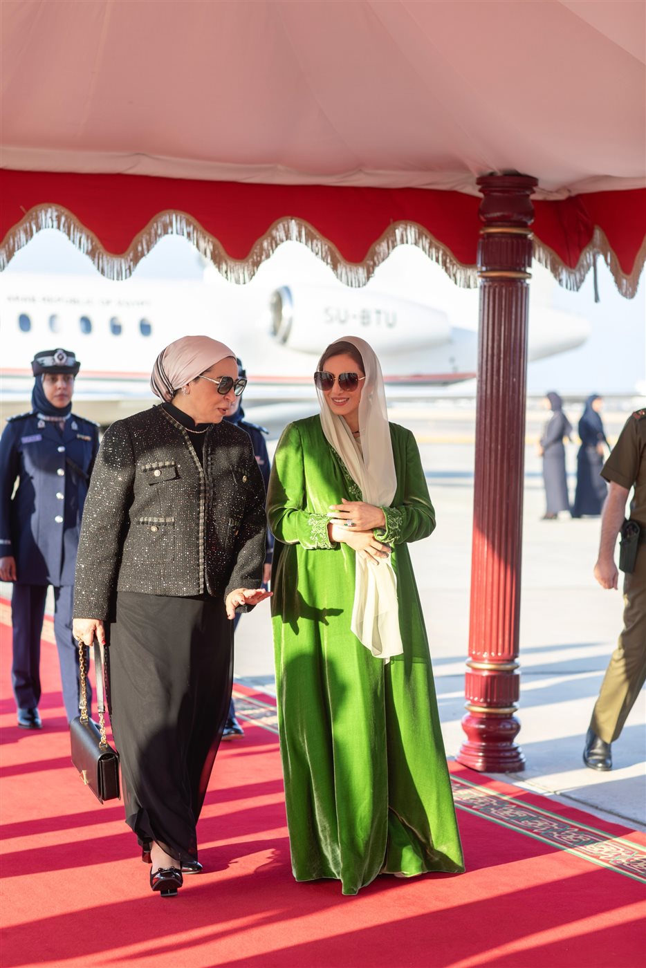 وكانت حرم السلطان هيثم في استقبالها والوفد المرافق لها لدى وصولهم إلى المطار السلطاني الخاص ورحبت حرم السلطان بقرينة الرئيس وتمنت لها ولوفدها المرافق زيارة موفقة وإقامة طيبة