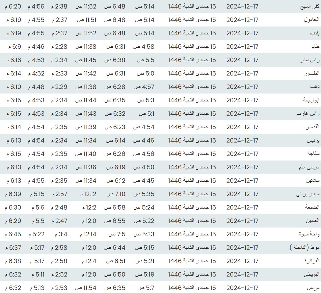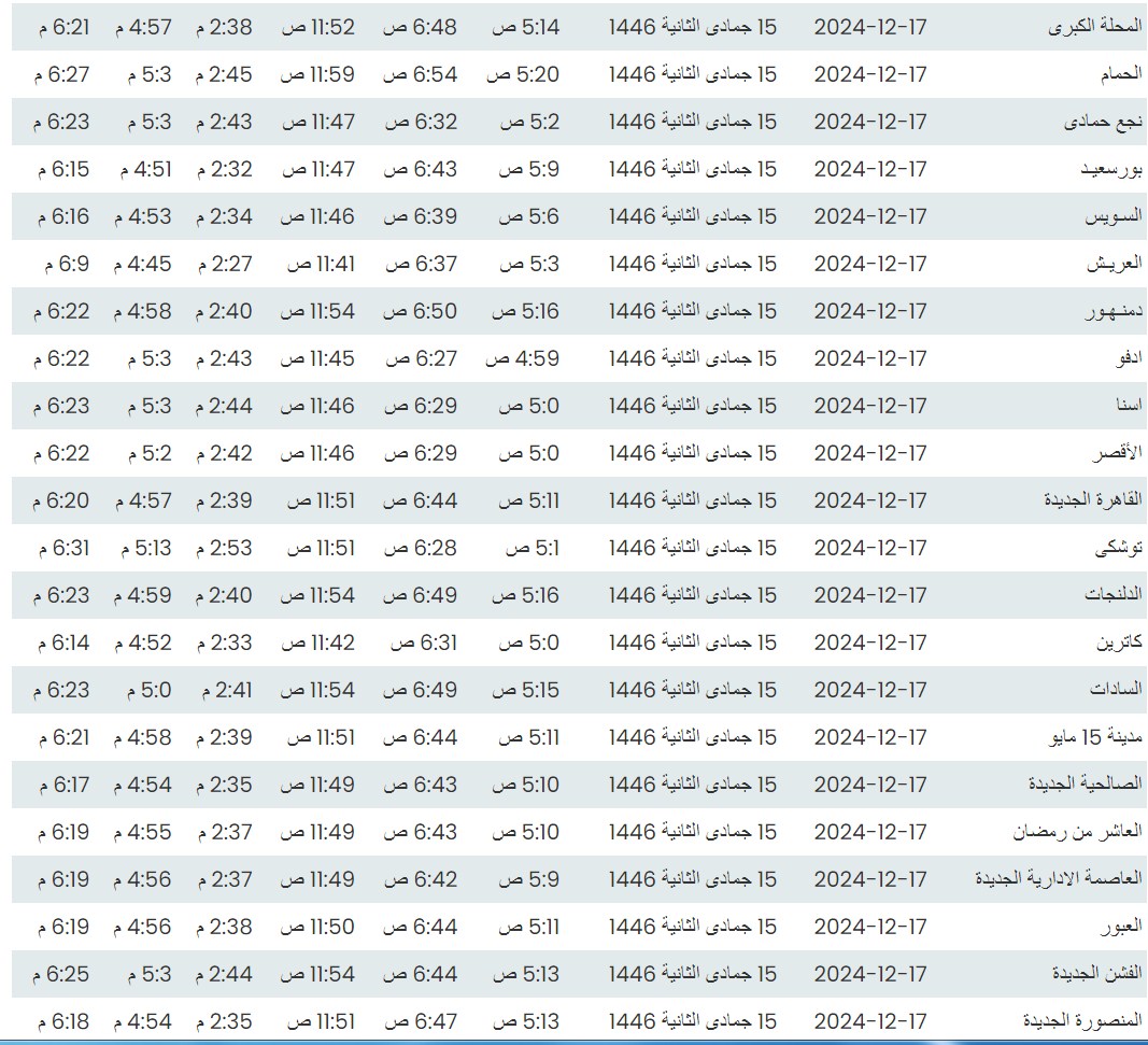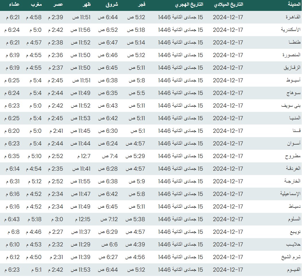 مواقيت الصلاة اليوم الثلاثاء 17 - 12- 2024 في القاهرة والمحافظات