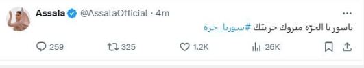 خرجت الفنانة السورية أصالة عبر حسابها الرسمي على موقع التواصل الاجتماعي x " تويتر سابقا"، تغريدة كتبت فيها، قائلة: "يا سوريا الحرّه مبروك حريتك سوريا حرة".