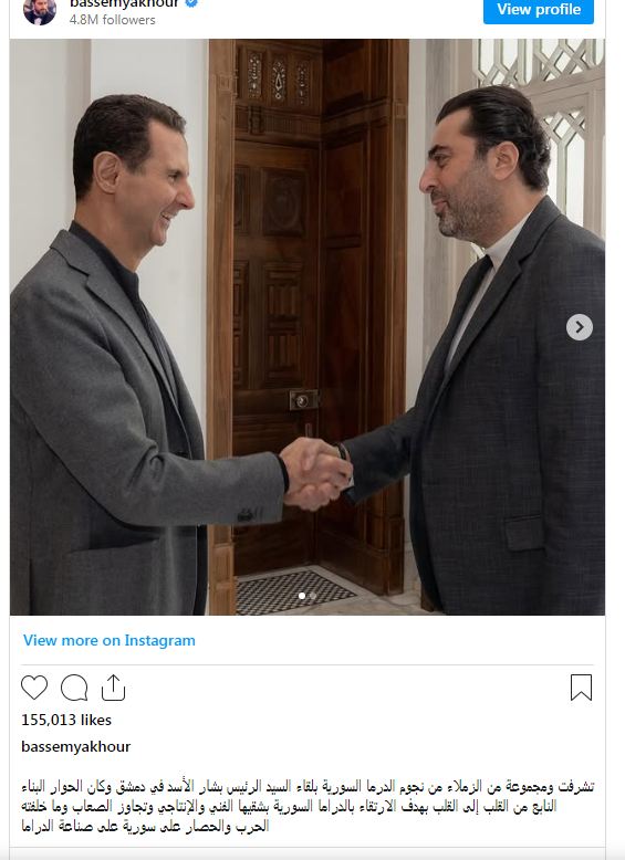 وكتب الفنان باسم ياخور عبر حسابه الخاص على موقع التواصل الاجتماعي انستجرام "تشرفت ومجموعة من الزملاء من نجوم الدراما السورية بلقاء الرئيس بشار الأسد في دمشق وكان الحوار البناء النابع من القلب إلى القلب بهدف الارتقاء بالدراما السورية بشقيها الفني والإنتاجي وتجاوز الصعاب وما خلفته الحرب والحصار على سورية على صناعة الدراما".