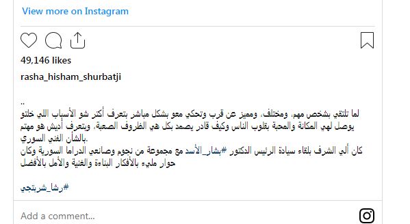 وكتبت المخرجة رشا شربتجي أن بشار الأسد أبدى اهتمامه ودعمه الكامل لقطاع الدراما، وأكد أن للدراما تأثيرًا كبيرًا في المجتمع.