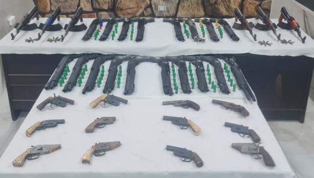 كما تم ضبط 4 قطع سلاح نارى غير مرخص عبارة عن (2 بندقية خرطوش- 2 فرد محلى - عدد من الطلقات مختلفة الأعيرة) بحوزة (11 متهم"لــ 7 منهم معلومات جنائية")، وتم إتخاذ الإجراءات القانونية.