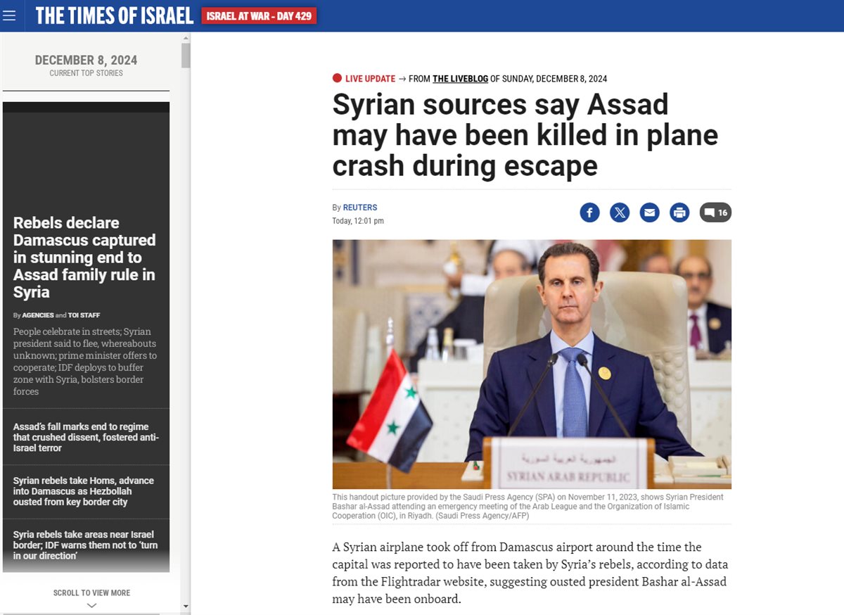 أشارت بعض المصادر السورية إلى تحطم طائرة الرئيس السوري المعزول، بشار الأسد، ومقتله مع 3 من أبنائه، الذين كانوا بالطائرة، وذلك ما أوردته صحيفة "The Times of Israel" العبري، والذي نقلته عن وكالة أنباء "رويترز"