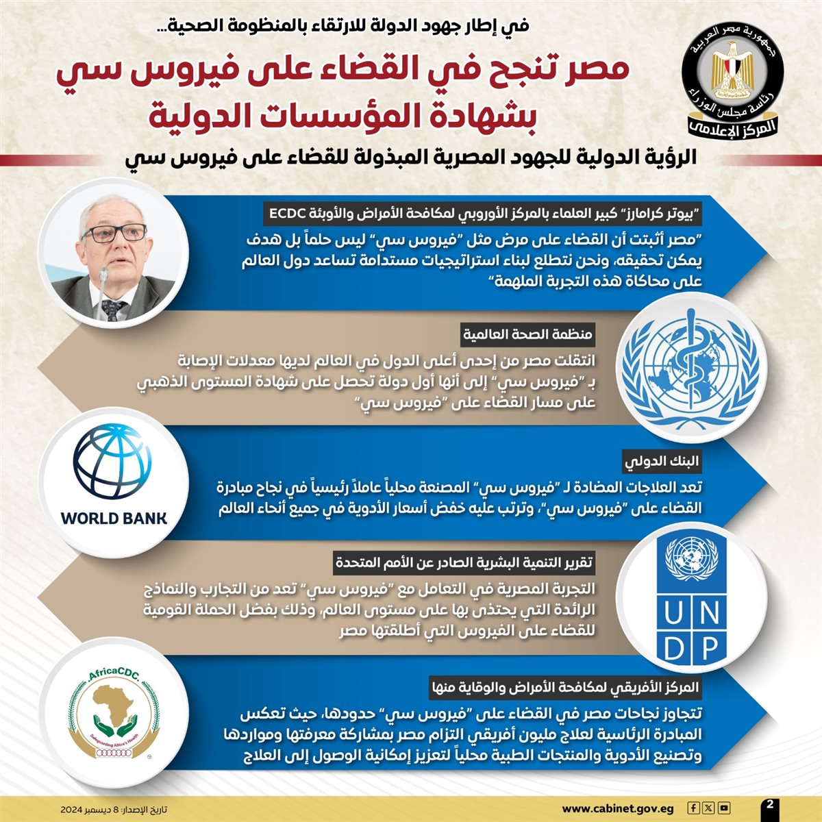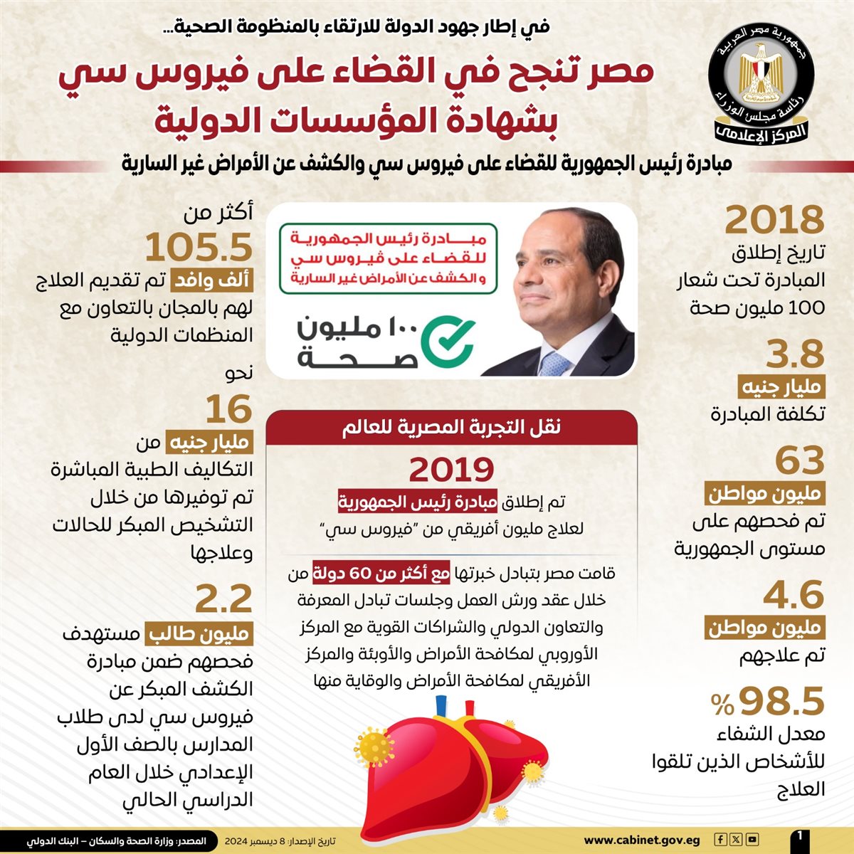 وفي هذا الصدد نشر المركز الإعلامي لمجلس الوزراء تقريرًا تضمن إنفوجرافات تسلط الضوء على نجاح مصر في القضاء على فيروس سي بشهادة المؤسسات الدولية، وذلك في إطار جهودها للارتقاء بالمنظومة الصحية.