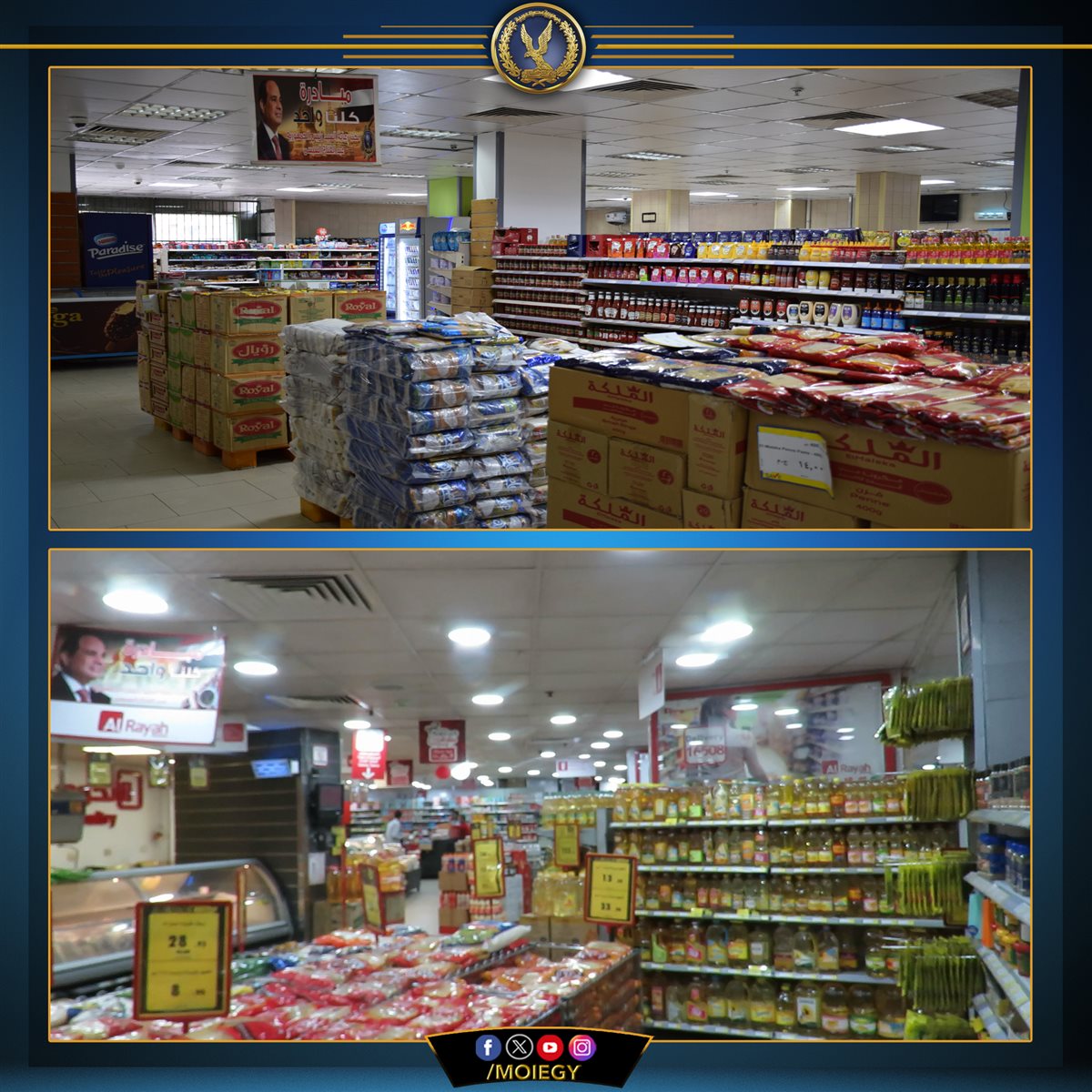 كما تواصل الوزارة توفير كافة السلع الغذائية وغير الغذائية بأسعار مخفضة من خلال (1050) منفذ ثابت ومتحرك وسرادقات بالميادين والشوارع الرئيسية وقوافل السيارات الخاصة بمنظومة "أمان" التابعة للوزارة، والموضحة على الموقع الرسمى لوزارة الداخلية (moi.gov.eg).