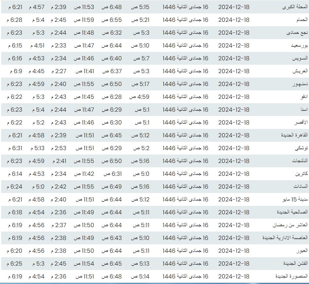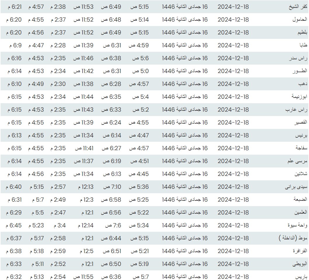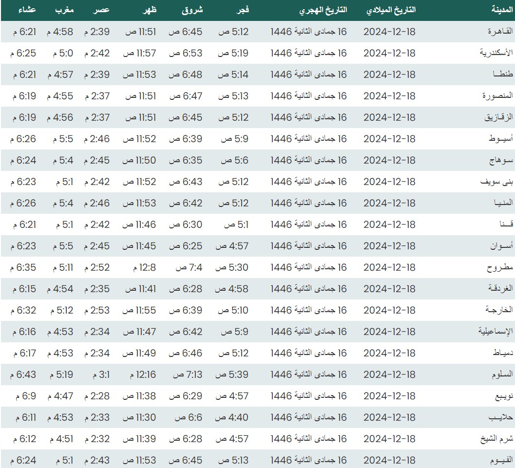 وفيما يلي مواقيت الصلاة، لعدد من مدن ومحافظات الجمهورية من واقع بيانات الهيئة العامة للمساحة