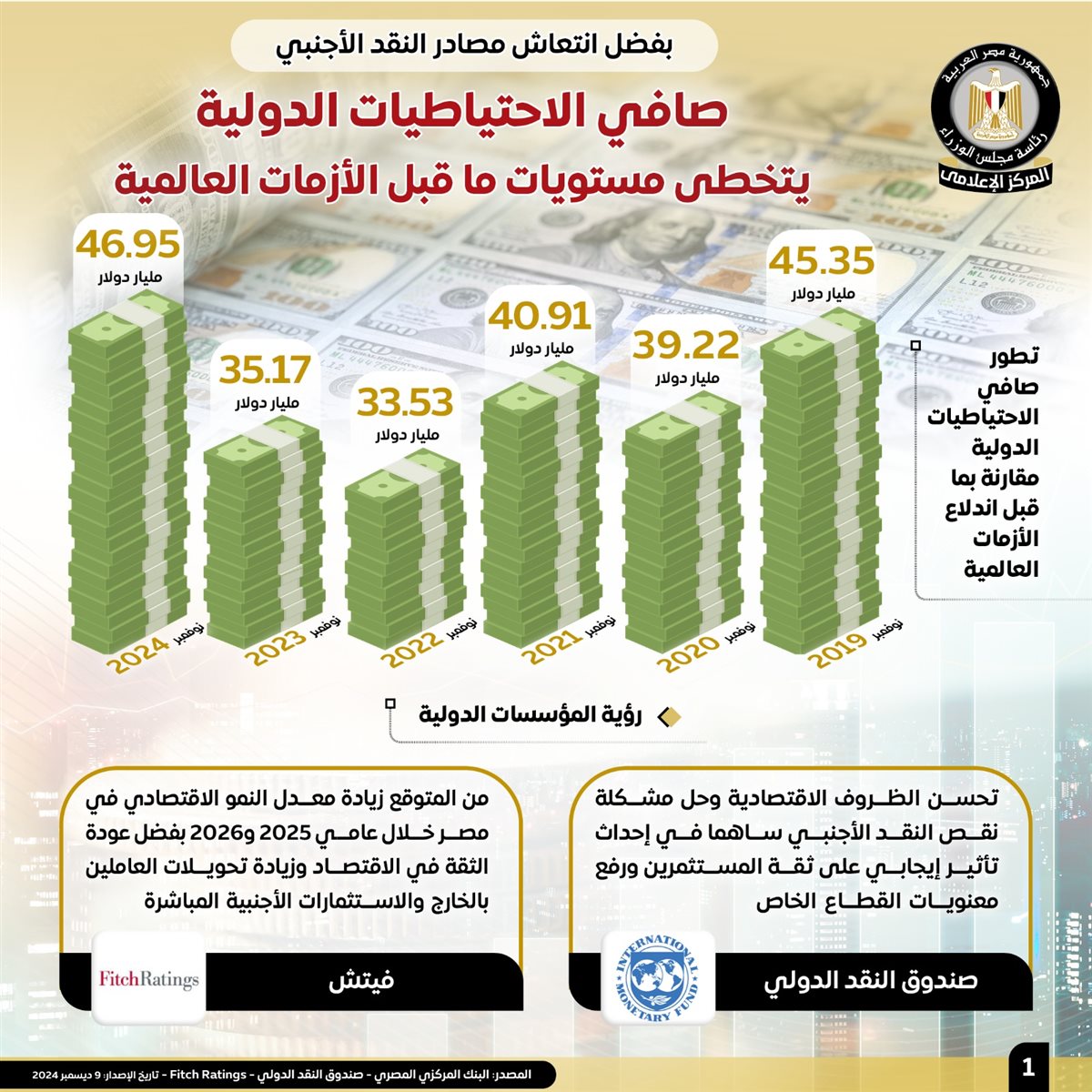 وفي هذا الصدد نشر المركز الإعلامي لمجلس الوزراء تقريرًا تضمن إنفوجرافات تسلط الضوء على تخطي صافي الاحتياطيات الدولية مستويات ما قبل الأزمات العالمية بفضل انتعاش مصادر النقد الأجنبي.