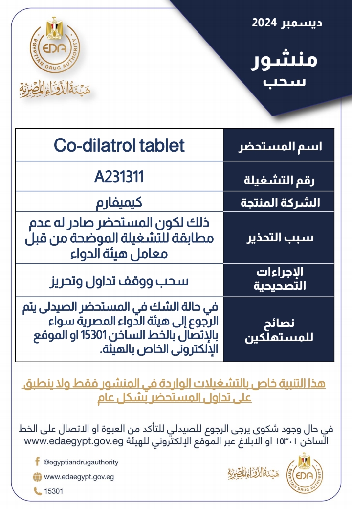 وتضمن منشور تحذيري آخر دواء لعلاج مرضي الضغط حيث قررت هيئة الدواء المصرية سحب ووقف وتداول مستحضر Co-dilatrol tablet من الصيدليات بناء على طلب الشركة المنتجة، لعدم مطابقة المستحضر للمواصفات ويستخدم الدواء لعلاج ارتفاع ضغط الدم ومنع حدوث الجلطات