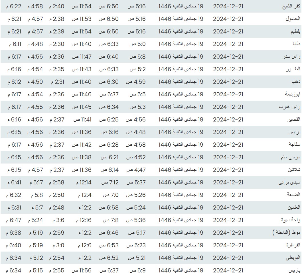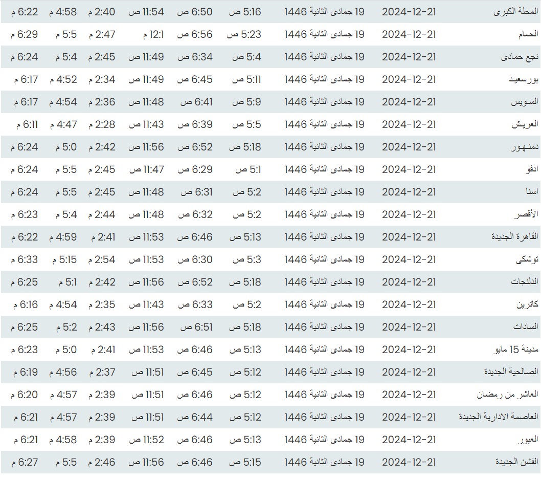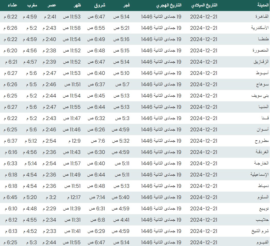 وفيما يلي مواقيت الصلاة، لعدد من مدن ومحافظات الجمهورية من واقع بيانات الهيئة العامة للمساحة
