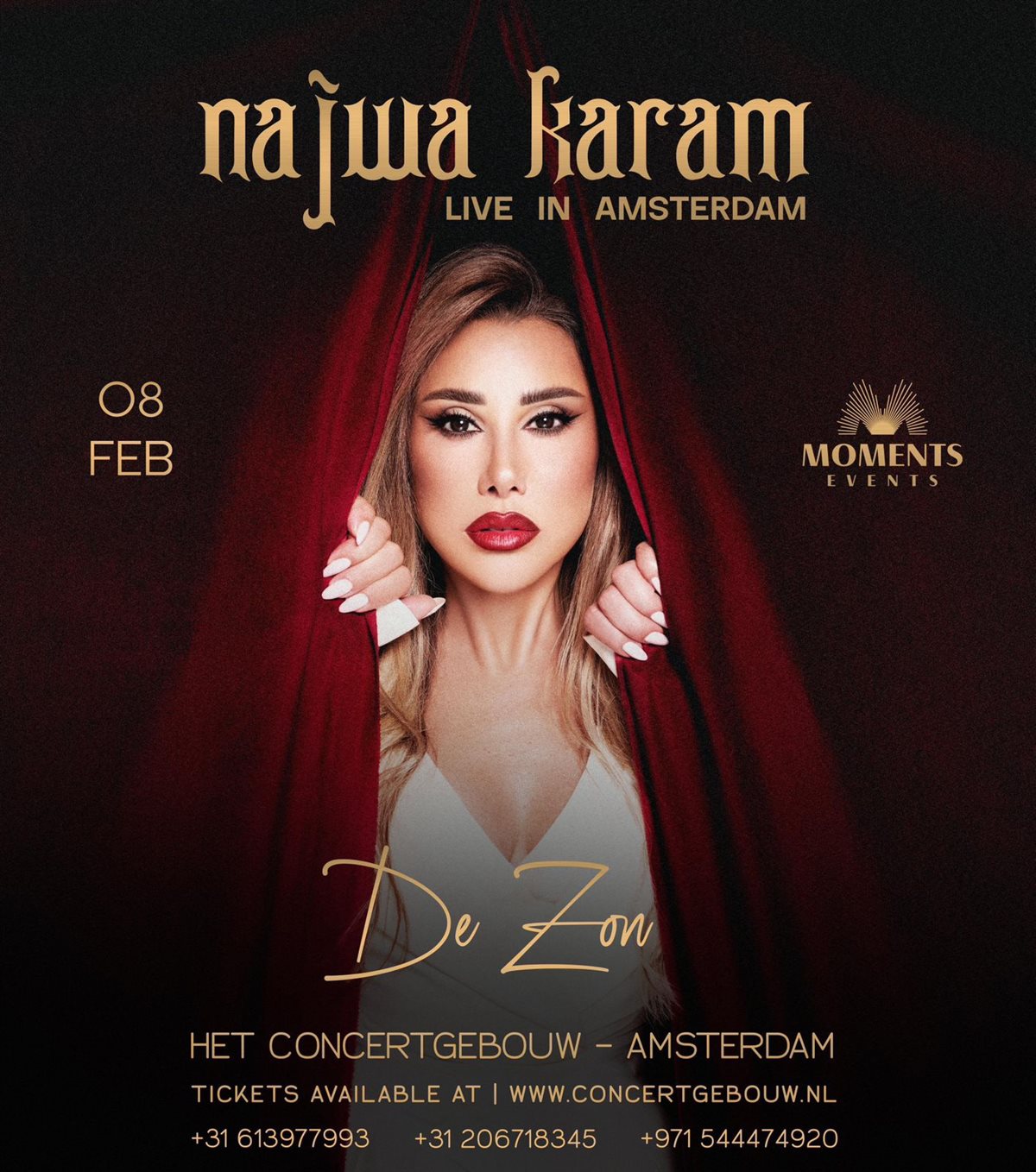 وتتابع نجوى كرم بعد ذلك جولتها العربية والعالمية بحفل في العاصمة الهولندية أمستردام، يوم 8 فبراير 2025، حيث ستقدم الحفل للجمهور العربي والأوروبي في قاعة الحفلات الموسيقية HET CONCERTERDA.