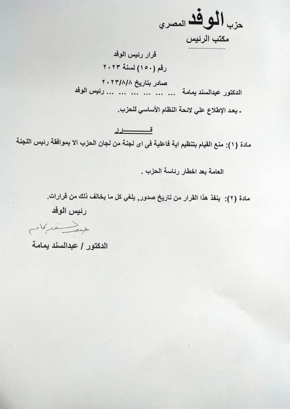 يمامة يصدر قرارا جديدا بشأن فعاليات حزب الوفد بالمحافظات (مستند)