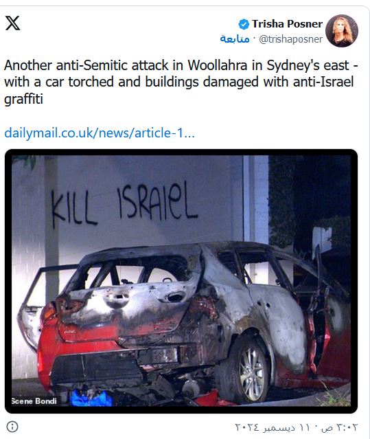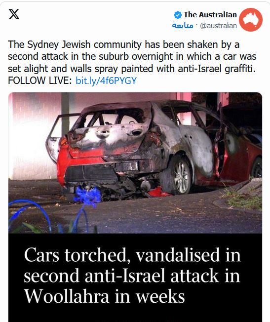قالت السلطات الأسترالية، اليوم الأربعاء، إن سيارة أُضرمت فيها النيران كما كُتبت رسائل مناهضة لإسرائيل على عقارين في سيدني بعد أيام قليلة من إشعال حريق متعمد في كنيس يهودي في ملبورن والذي يجري التحقيق فيه باعتباره عملًا إرهابيًّا.