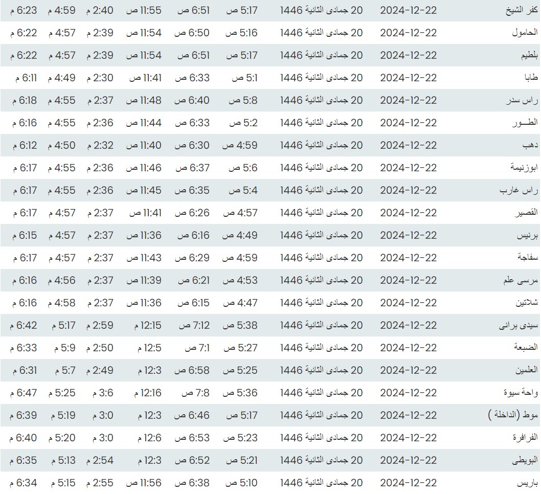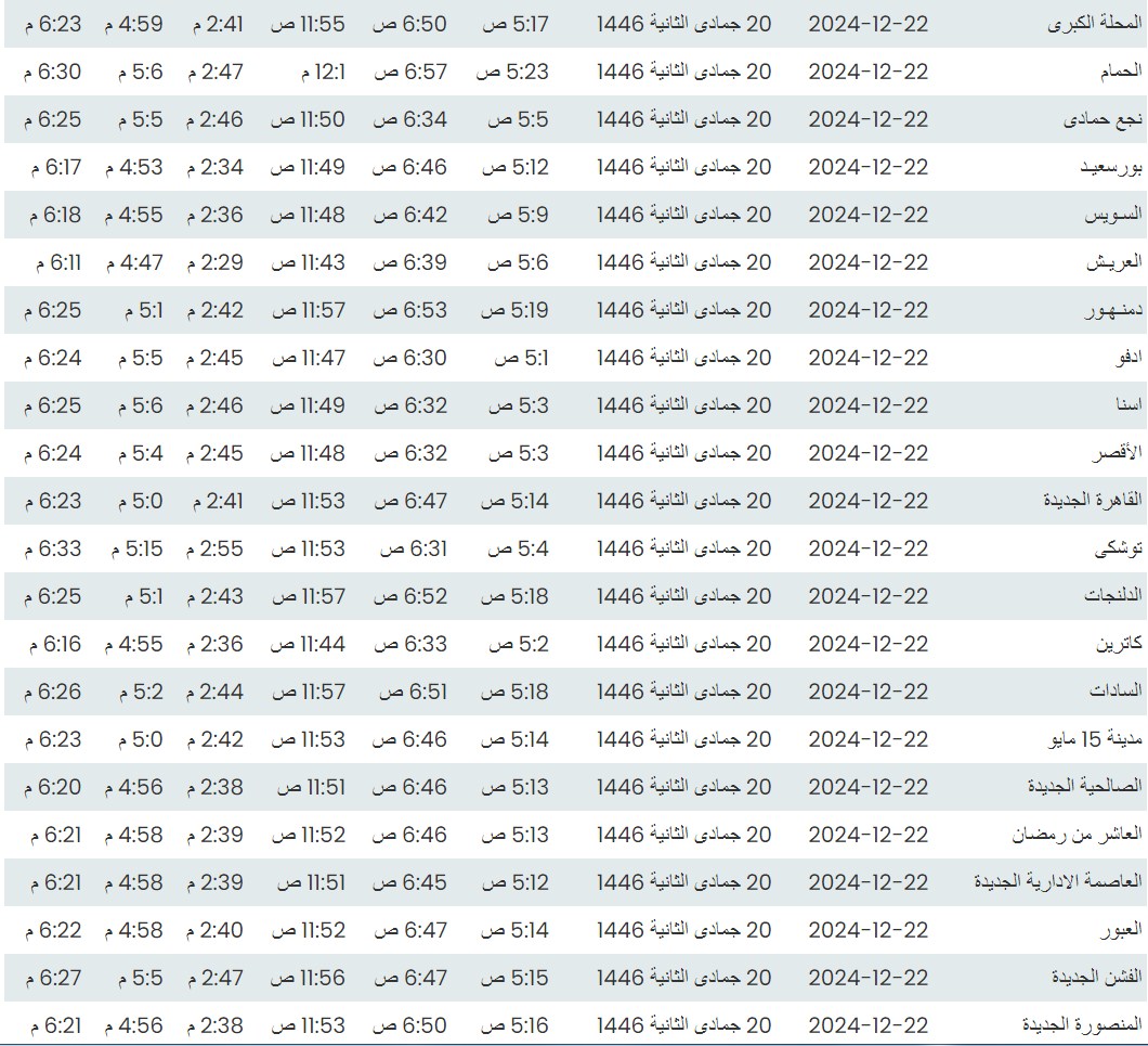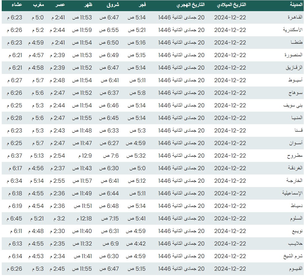 وفيما يلي مواقيت الصلاة، لعدد من مدن ومحافظات الجمهورية من واقع بيانات الهيئة العامة للمساحة