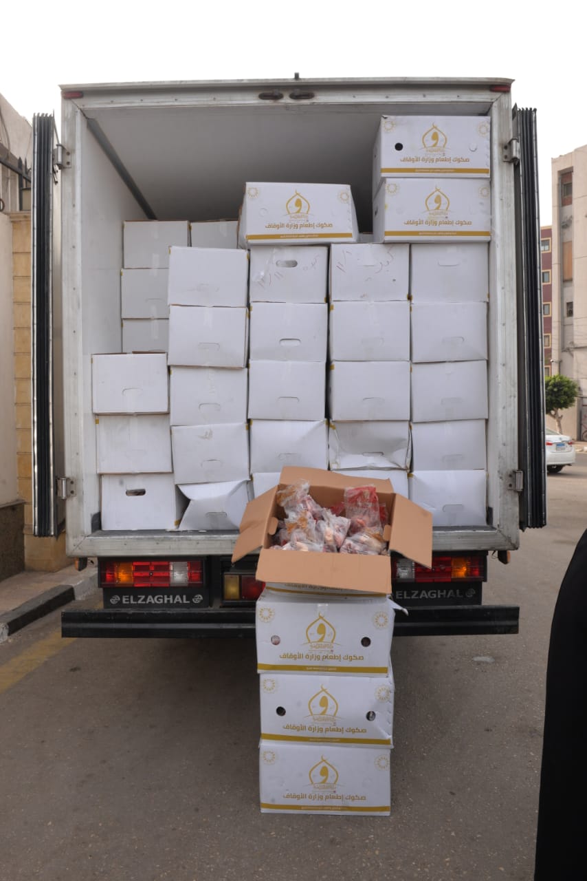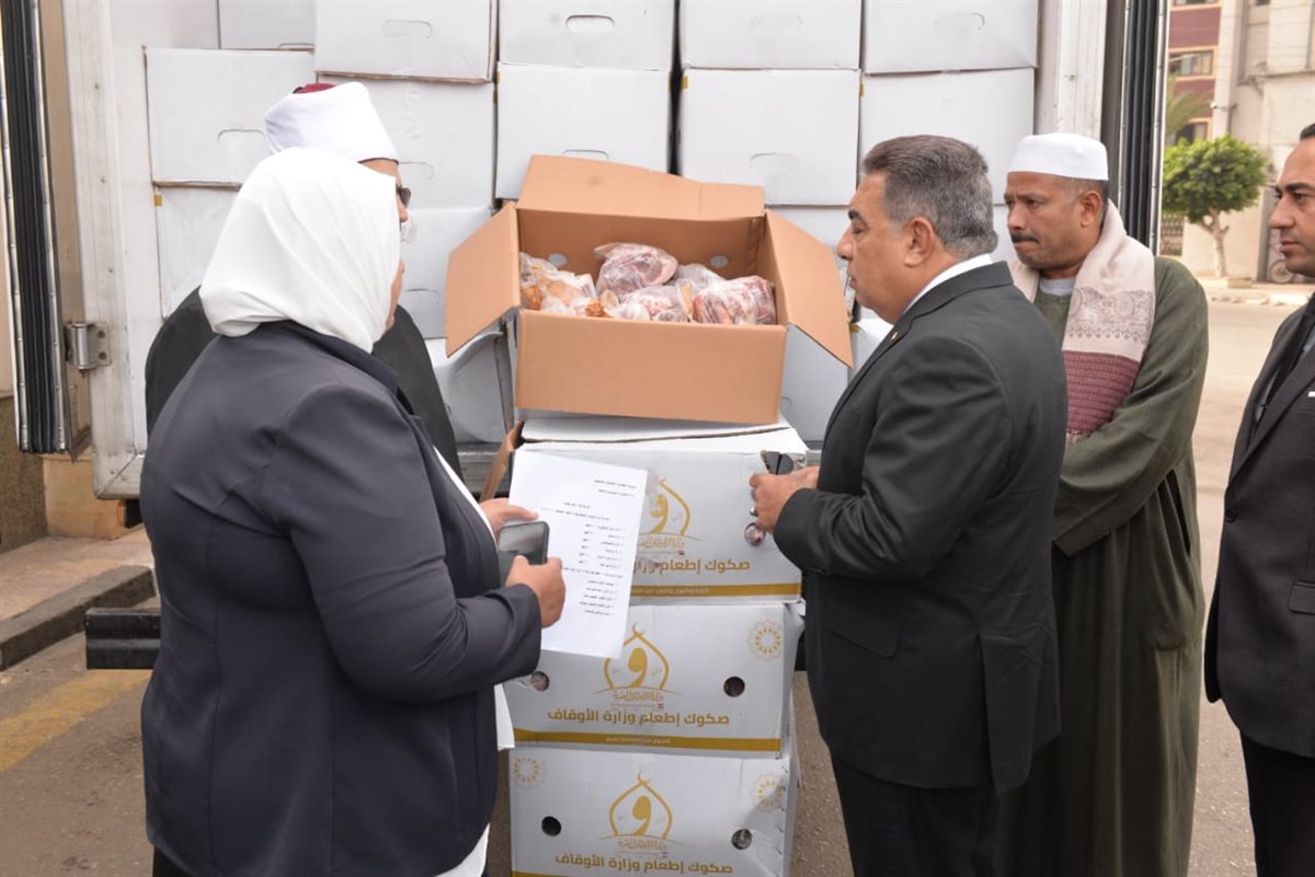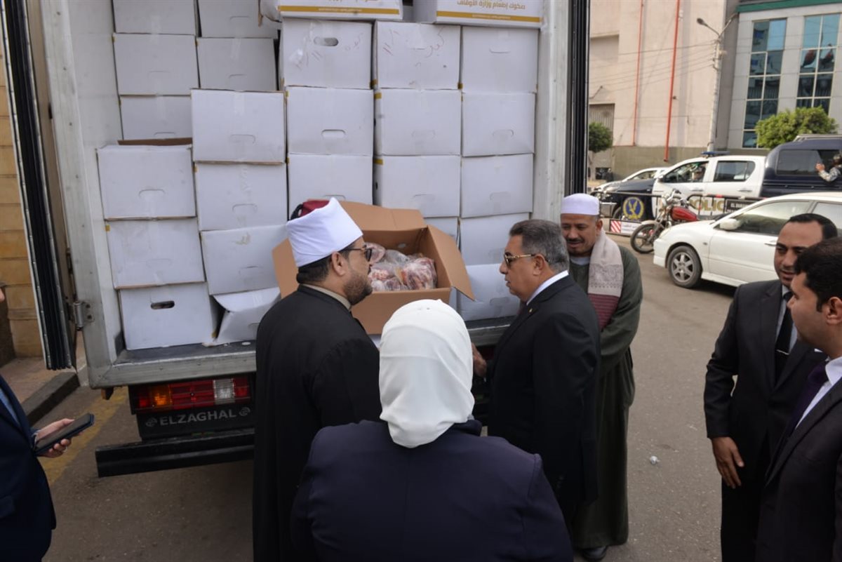وثمن جهود وزارة الأوقاف والتضامن الاجتماعي من خلال توزيع لحوم صكوك الإطعام وسلة المواد الغذائية على الأسر الأولى بالرعاية على مستوى الجمهورية.