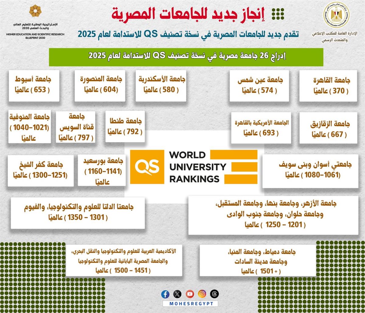 أعلن تصنيف QS العالمى نتائج نسخته للاستدامة للعام 2025، وأظهرت النتائج إدراج 26 جامعة مصرية في التصنيف، والذي شمل أكثر من 1743 جامعة من مختلف دول العالم، وذلك بزيادة 3 جامعات مقارنة بعدد الجامعات المصرية المُدرجة بالتصنيف في العام الماضي 2024.