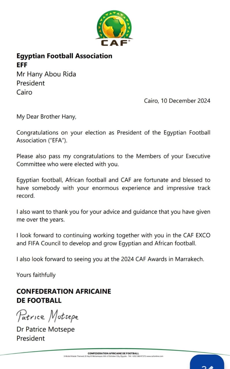 وأضاف موتسيبي أنه يود شكر أبوريدة بشكل شخصي على كافة النصائح التي حصل عليها منه طوال السنوات الماضية، وأنه يتطلع لمزيد من العمل المتواصل مستقبلا، من أجل تطوير كرة القدم في مصر وقارة أفريقيا.