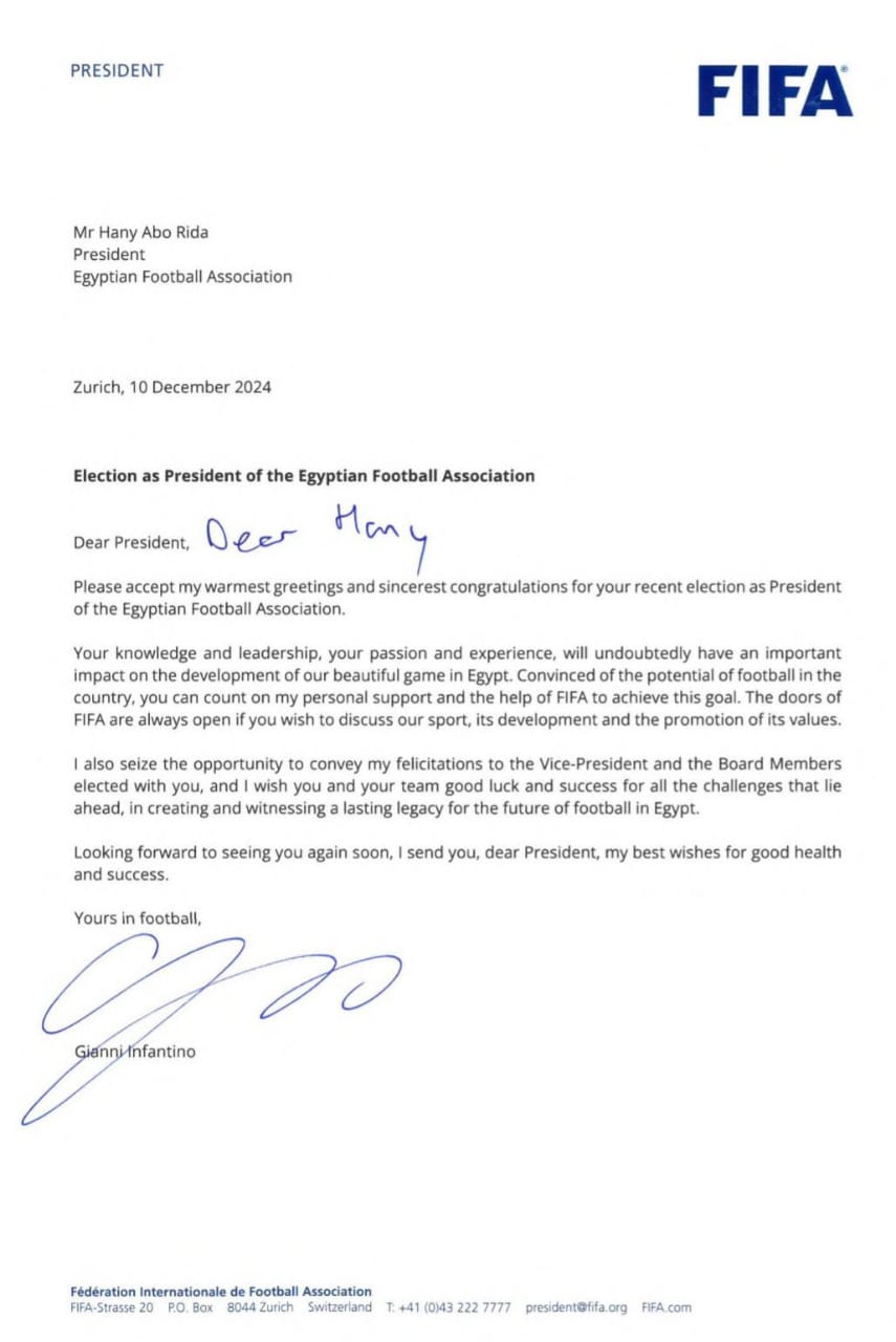 وقال إنفانتينو في خطابه لرئيس اتحاد الكرة المصري الجديد، إنه يثق في أن خبرته وقيادته ستقود الكرة المصرية واللعبة الشعبية الأولى إلى التطور والتقدم، وأن وجوده على رأس قيادة الكرة في مصر، ستساعد الفيفا على تحقيق أهدافها في تطوير اللعبة في مصر، وأبواب الفيفا مفتوحة دائما أمامه لمناقشة أي تطوير في كرة القدم مستقبلا بخوص الكرة المصرية.