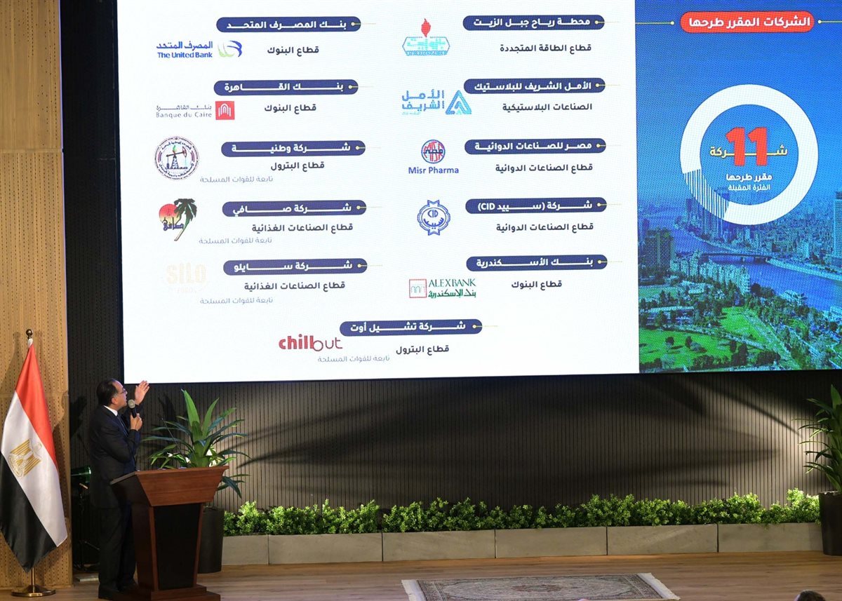 ونوه رئيس الوزراء إلى أنه فيما يتعلق بشركات القوات المسلحة التي سيتم طرحها في البورصة المصرية على مدار العام القادم، فإنها تتضمن شركة "وطنية"، وشركة "صافى"، وشركة "سايلو" للصناعات الغذائية، وشركة "تشيل أوت"، مُوضحًا أنه من المقرر طرح شركتي "وطنية" و"صافى" بحلول منتصف العام القادم، يتبعهما في الطرح شركتا "سايلو" و"تشيل أوت" بنهاية العام نفسه.