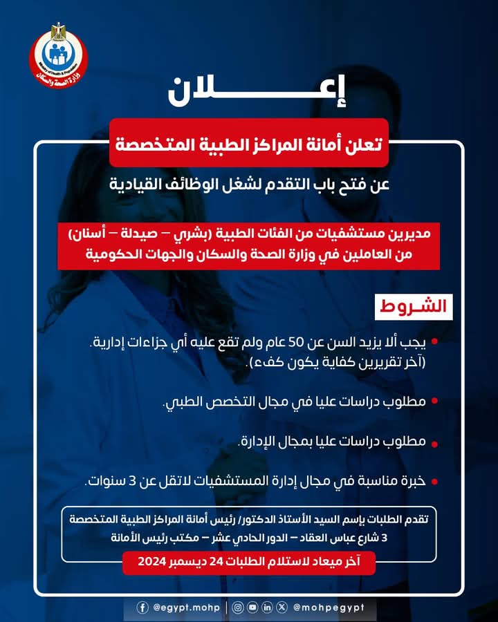 أعلنت أمانة المراكز الطبية المتخصصة بوزارة الصحة عن فتح باب التقدم لشغل الوظائف القيادية مديري مستشفيات من الفئات الطبية بشري – صيدلة – أسنان من العاملين في وزارة الصحة والسكان والجهات الحكومية.