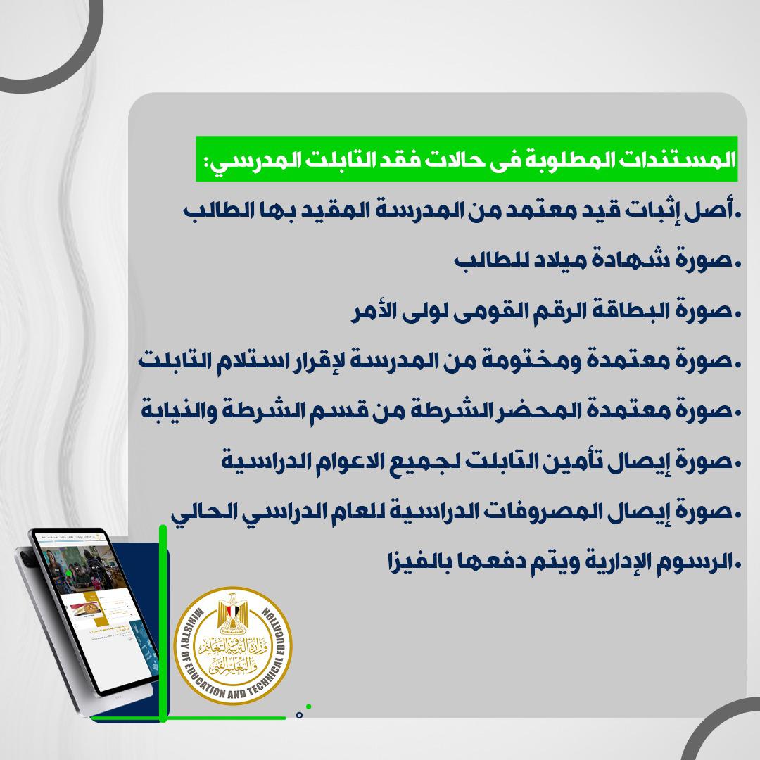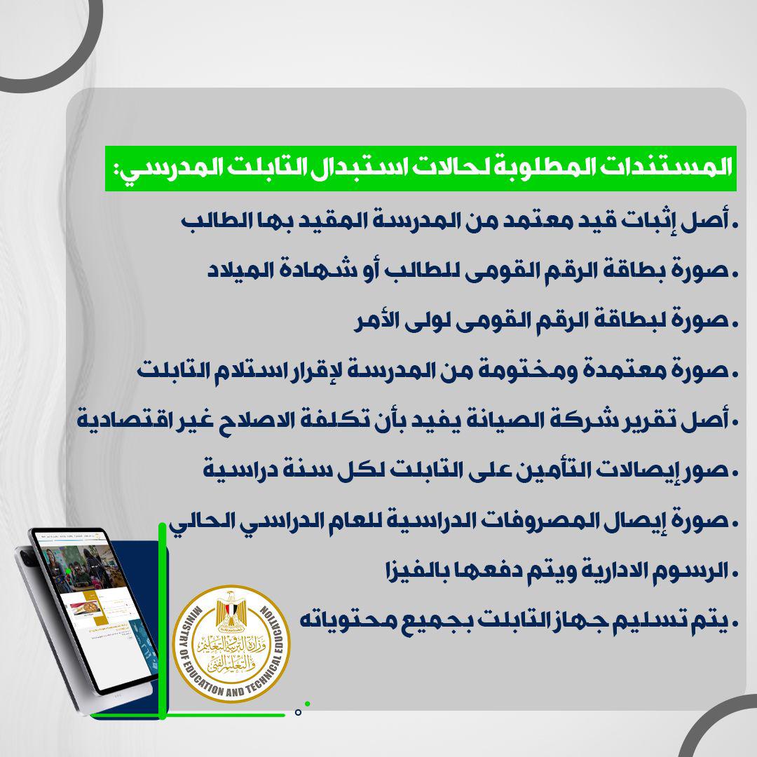 وأوضحت وزارة التربية والتعليم أنه في إطار حرصها على تطوير المنظومة التعليمية وخاصة في المرحلة الثانوية العامة، مع تزويد الطلاب بأحدث الأجهزة التكنولوجية لإحداث نقلة تعليمية، فقد قررت وزارة التعليم إعادة التابلت لمخازن الإدارات بعد انتهاء طلاب الصف الأول الثانوي هذا العام من الثانوية العامة.